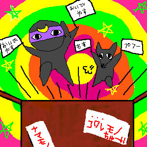 A;夢ですね。わかります。と二度寝る。…しかしピンポンが鳴って眠りを邪魔された!!うっさいので出てみるとクロぬこ……お。空さんから小包だーーーー!!何が……あれ?今この荷物動い………